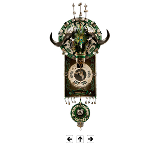 | Kopf:.Wasserbüffelhorn, Hahnenfedern, Bauchtanzkostüm, Ölkännchen. Platte: von meinem Opa Fritz 1959, alte Mannscheibe Kette: Kinderkönigscheibe von meinem Cousin, Hühnergott Prachtexemplar, Vereinsabzeichen, Elfenbein Vogelkopf Schmuck: Hühnergötter aus Rügen, Schützenvereinsabzeichen, Pistole aus dem Meer in Bilbao, diverse Abzeichen, ausgeschnittene Tapete, Angelhaken, Metallgürtel, Auszeichnungen, Borte, Mistgabel, Name: alter Mopedreifen |